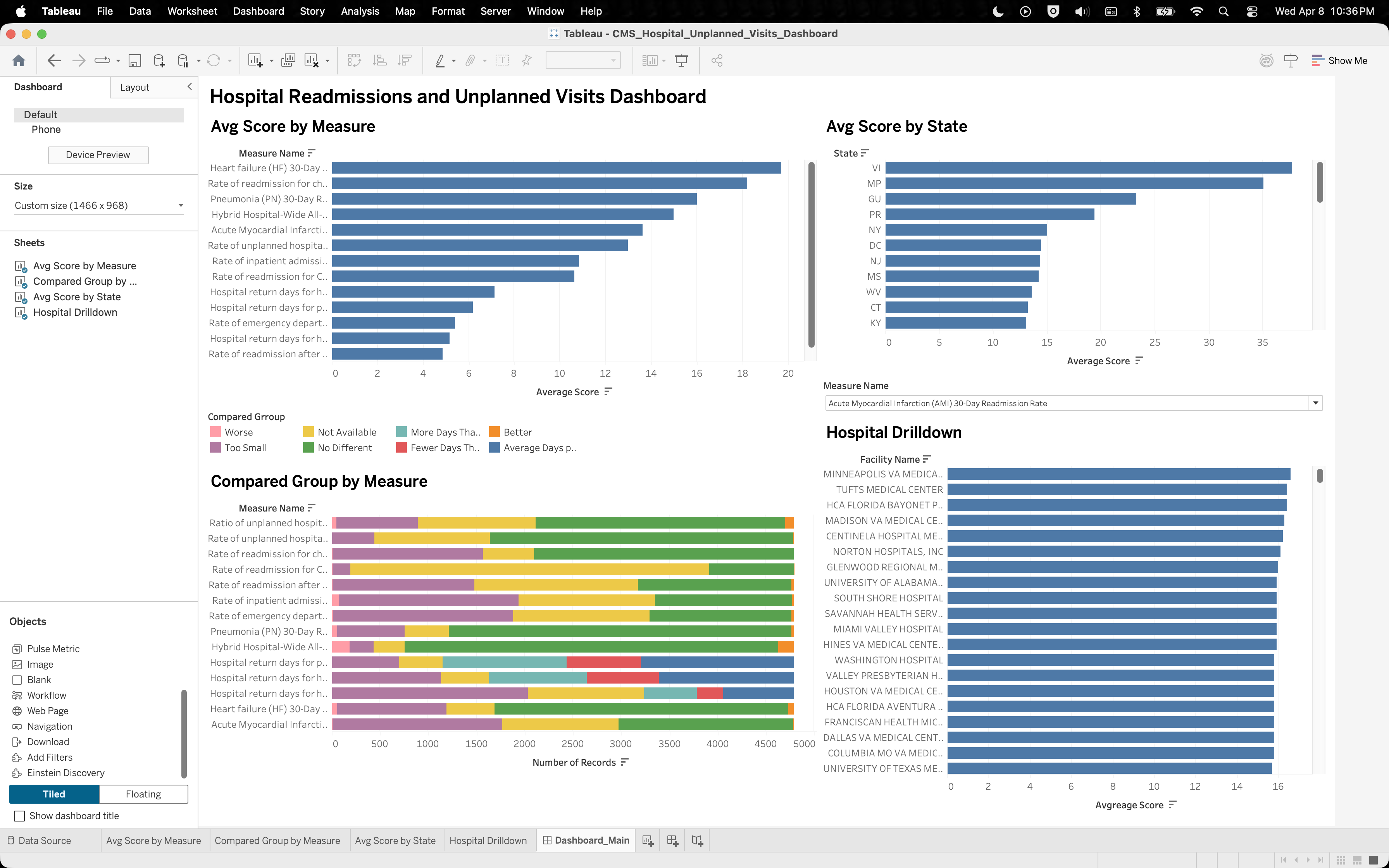 Interactive healthcare analytics project using CMS hospital quality data to compare measures, states, and hospital-level performance.
